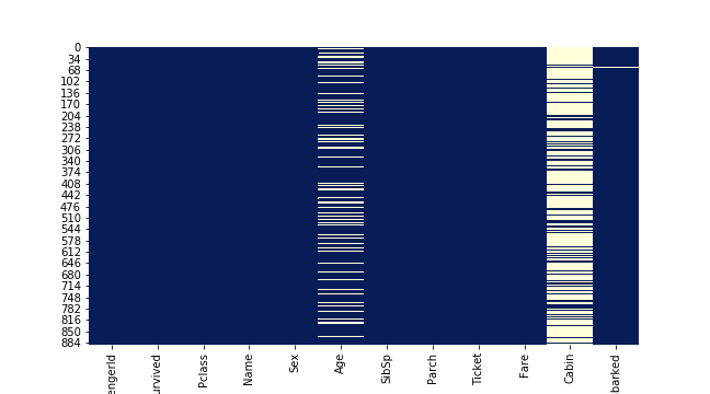 1 2 3 4 fig, ax = plt.subplots(figsize=(9 , 5 )) sns.heatmap(df.isnull(), cbar=False , cmap="YlGnBu_r" ) plt.savefig("../img/2019-08-15_泰坦尼克之灾_1.png" ) plt.close()