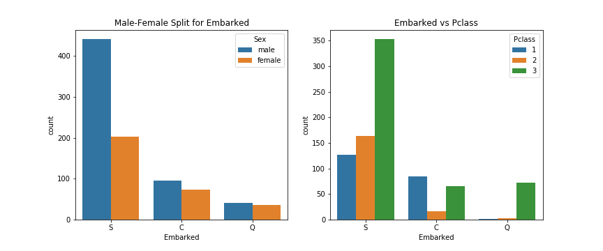 1 2 3 4 5 6 7 8 9 f, ax = plt.subplots(1 , 2 , figsize=(12 , 5 )) sns.countplot('Embarked' , hue='Sex' , data=df, ax=ax[0 ]) ax[0 ].set_title('Male-Female Split for Embarked' ) sns.countplot('Embarked' , hue='Pclass' , data=df, ax=ax[1 ]) ax[1 ].set_title('Embarked vs Pclass' ) plt.subplots_adjust(wspace=0.2 , hspace=0.5 ) plt.savefig("../img/2019-08-15_泰坦尼克之灾_10.png" ) plt.close()