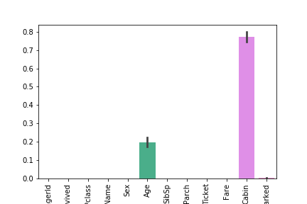 1 2 3 4 ax = sns.barplot(data=df.isnull()) plt.xticks(rotation=90 ) plt.savefig("../img/2019-08-15_泰坦尼克之灾_2.png" ) plt.close()
