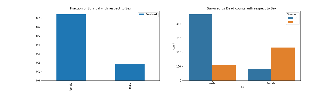 1 2 3 4 5 6 7 f, ax = plt.subplots(1 , 2 , figsize=(18 , 5 )) df[['Sex' , 'Survived' ]].groupby(['Sex' ]).mean().plot.bar(ax=ax[0 ]) ax[0 ].set_title('Fraction of Survival with respect to Sex' ) sns.countplot('Sex' , hue='Survived' , data=df, ax=ax[1 ]) ax[1 ].set_title('Survived vs Dead counts with respect to Sex' ) plt.savefig("../img/2019-08-15_泰坦尼克之灾_4.png" ) plt.close()
