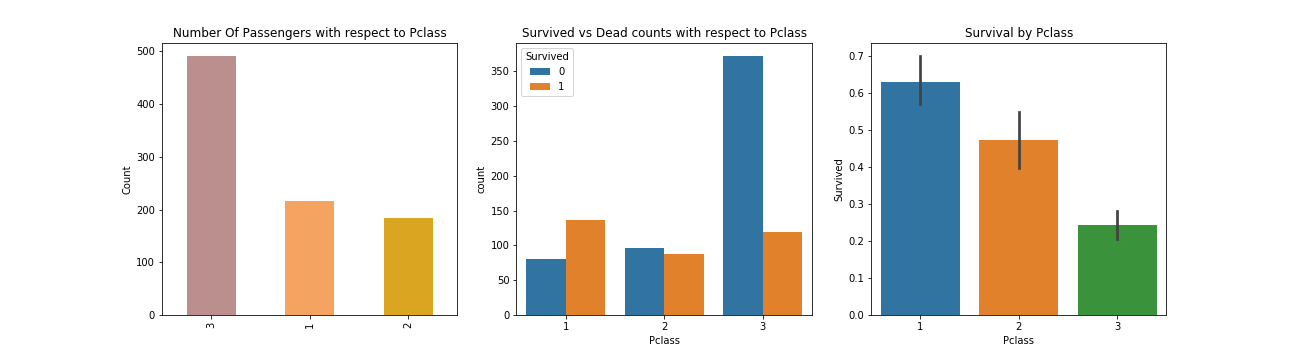 1 2 3 4 5 6 7 8 9 10 11 f, ax = plt.subplots(1 , 3 , figsize=(18 , 5 )) df['Pclass' ].value_counts().plot.bar( color=['#BC8F8F' , '#F4A460' , '#DAA520' ], ax=ax[0 ]) ax[0 ].set_title('Number Of Passengers with respect to Pclass' ) ax[0 ].set_ylabel('Count' ) sns.countplot('Pclass' , hue='Survived' , data=df, ax=ax[1 ]) ax[1 ].set_title('Survived vs Dead counts with respect to Pclass' ) sns.barplot(x="Pclass" , y="Survived" , data=df, ax=ax[2 ]) ax[2 ].set_title('Survival by Pclass' ) plt.savefig("../img/2019-08-15_泰坦尼克之灾_5.png" ) plt.close()