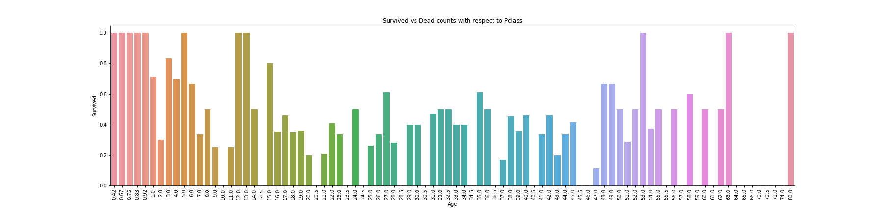 1 2 3 4 5 6 f, ax = plt.subplots(1 , 1 , figsize=(25 , 6 )) sns.barplot(df['Age' ], df['Survived' ], ci=None , ax=ax) ax.set_title('Survived vs Dead counts with respect to Pclass' ) plt.xticks(rotation=90 ) plt.savefig("../img/2019-08-15_泰坦尼克之灾_6.png" ) plt.close()