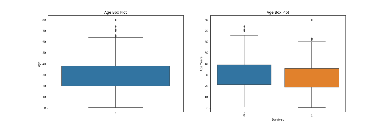 1 2 3 4 5 6 7 8 9 10 11 12 13 f, ax = plt.subplots(1 , 2 , figsize=(18 , 6 )) ax[0 ].set_title('Age Box Plot' ) ax[0 ].set_ylabel('Age Years' ) sns.boxplot(y='Age' , data=df, ax=ax[0 ]) sns.boxplot(x='Survived' , y='Age' , data=df, ax=ax[1 ]) ax[1 ].set_title('Age Box Plot' ) ax[1 ].set_ylabel('Age Years' ) plt.savefig("../img/2019-08-15_泰坦尼克之灾_7.png" ) plt.close()