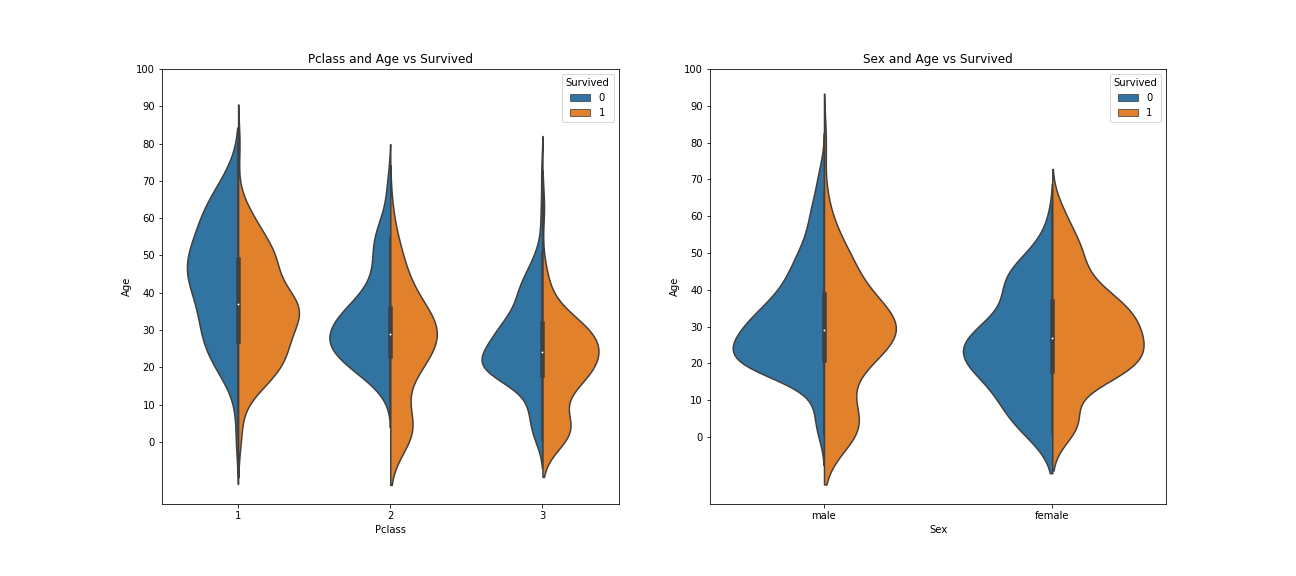 1 2 3 4 5 6 7 8 9 10 11 12 f, ax = plt.subplots(1 , 2 , figsize=(18 , 8 )) sns.violinplot( "Pclass" , "Age" , hue="Survived" , data=df, split=True , ax=ax[0 ]) ax[0 ].set_title('Pclass and Age vs Survived' ) ax[0 ].set_yticks(range (0 , 110 , 10 )) sns.violinplot( "Sex" , "Age" , hue="Survived" , data=df, split=True , ax=ax[1 ]) ax[1 ].set_title('Sex and Age vs Survived' ) ax[1 ].set_yticks(range (0 , 110 , 10 )) plt.savefig("../img/2019-08-15_泰坦尼克之灾_8.png" ) plt.close()