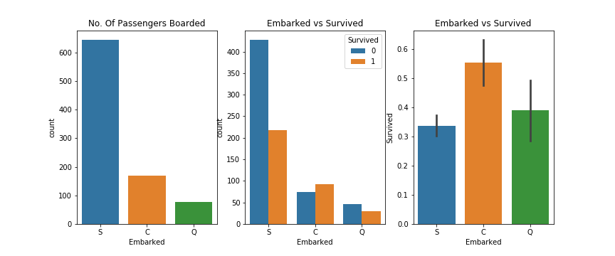 1 2 3 4 5 6 7 8 9 10 f, ax = plt.subplots(1 , 3 , figsize=(12 , 5 )) sns.countplot('Embarked' , data=df, ax=ax[0 ]) ax[0 ].set_title('No. Of Passengers Boarded' ) sns.countplot('Embarked' , hue='Survived' , data=df, ax=ax[1 ]) ax[1 ].set_title('Embarked vs Survived' ) sns.barplot('Embarked' , 'Survived' , data=df, ax=ax[2 ]) ax[2 ].set_title('Embarked vs Survived' ) plt.savefig("../img/2019-08-15_泰坦尼克之灾_9.png" ) plt.close()
