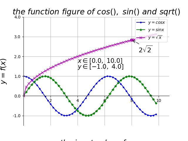 plt.title(r'$the \ function \ figure \ of \ cos(), \ sin() \ and \ sqrt()$', fontsize=19) plt.xlabel(r'$the \ input \ value \ of \ x$', fontsize=18, labelpad=88.8) plt.ylabel(r'$y = f(x)$', fontsize=18, labelpad=12.5)